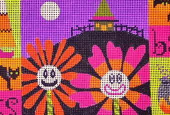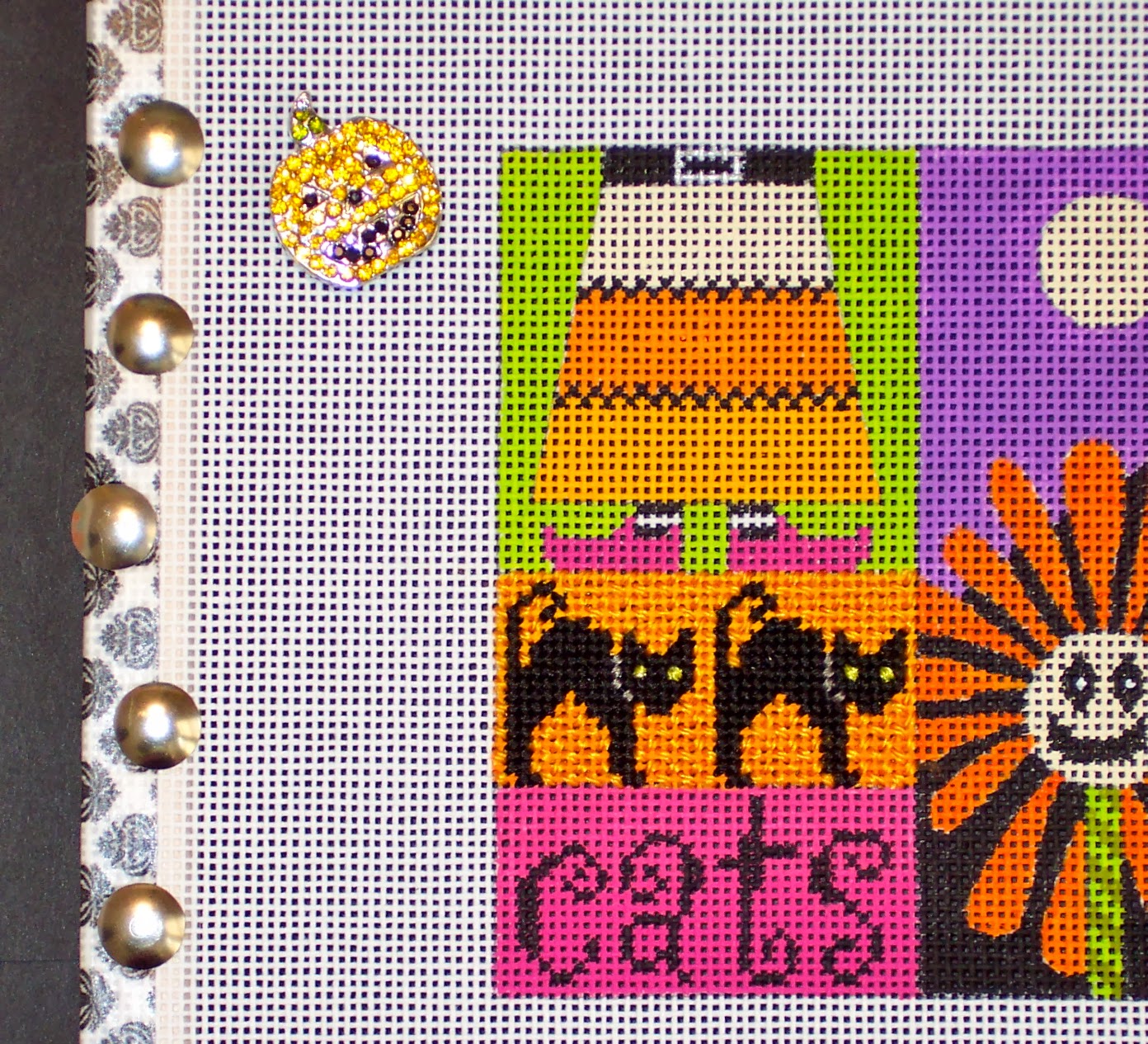I'm one of those literal types with the clues, so I thought about stitching the straight elements on my canvas, in this case the flower stems. But I really wanted a bigger start than that, having learned from last year's Games that only stitching teeny areas each month leaves you with a LOT of stitching to do come November's finish date! So I decided to go "straight" to the area I really wanted to stitch, which was the kitty cats panel: