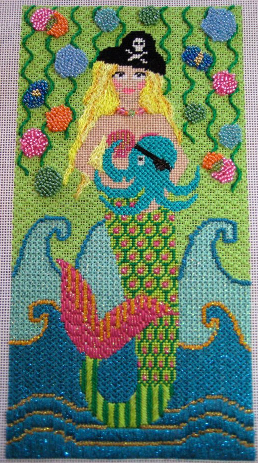 I realized it's been a while since I updated you on the Stitching Games over on Stitcherie. Last month's clue was "Cheese", so I stitched in my the face and hair on my canvas, with the story that my Little Witch (canvas by Patty Paints) was getting ready for picture day at Spell School. Making up the stories that go along with these clues add so much fun to the actual stitching-- go check out the discussion group over on Stitcherie to see what I mean, our participants have really come up with some entertaining yarns (no pun intended!)Next up is a fabulous stitch of my Pirate Mermaid by Andrea K of Stitch by Stitch in Larchmont, New York. Great work, love the beads! Be sure to check out the shop blog to see more!