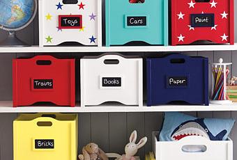 While you might love that bedside table or cabinet that ties in with the rest of your home décor, adult storage solutions rarely translate well to children's needs. Sticky dresser drawers are hard for small hands to manage, folding closet doors pinch fingers and jump their rails when pushed from the bottom, and full size wardrobe rails are out of reach. That said, traditional toy boxes always end up housing a tangled jumble of mixed and scattered toy parts; so use floor-level open containers to hold toys, and open plastic baskets to store socks and underwear – and anything else that they’ll need to be able to access for themselves on a day to day basis.