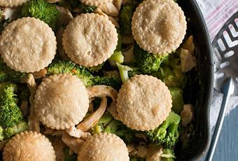 Preheat oven to 400 degrees Fahrenheit. On a lightly floured surface, roll out pie dough to a circle 10 inches wide. Using a biscuit or cookie cutter, cut out discs of pie dough. Place on an ungreased baking sheet. Bake in preheated oven for 8 to 10 minutes, or until lightly golden. Remove to cool.