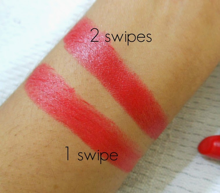 01 Fire Your Ex is a bright orange based red shade - great for festive season/evening parties. The color is quite pretty and would flatter on almost every complexion. The shade is richly pigmented and a swipe of color gives semi-opaque coverage but with second swipe the finish is almost opaque and creamy matte. Highly Recommended, if you're looking for a red shade in budget!Rating : 4.5/5
