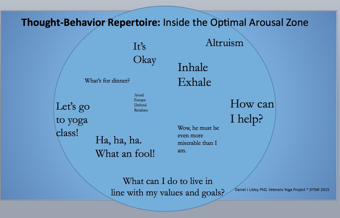 Now we have figures that illustrates the thought-behavior repertoire associated with an arousal level outside the window of tolerance and two within the window. When the arousal level is "optimum," your thoughts and behavior possibilities expand, until it is possible to consider altruistic possibilities and living in line with your basic values and goals. (I like how in that illustration, some of the thoughts are literally “out of the box.”)