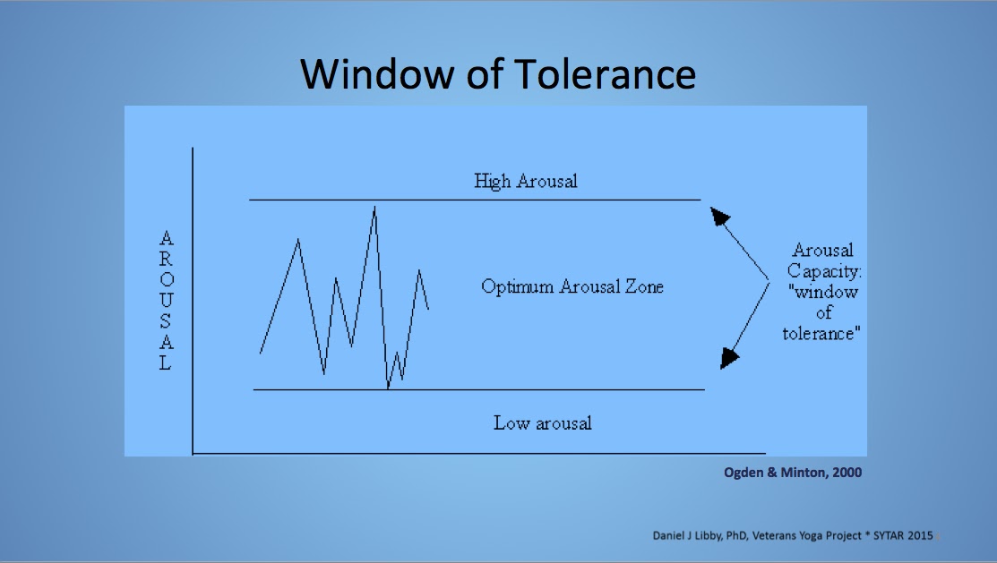 First, Dan introduced the concept of “window of tolerance.” This is a level of arousal ("arousal" refers to the intensity of the Stress or Fight or Flight response) that is appropriate to the environment. While, for example, for a soldier, a very high level of arousal is appropriate in an actual battle, that same level is not appropriate while you’re stuck in a traffic jam or working at the office. This figure conveys the basic levels of arousal.