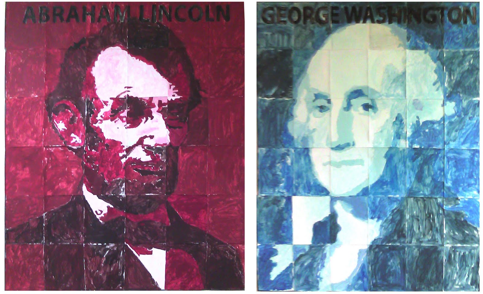 This art comes from Arizona, where Elizabeth White taught her second graders how to make shades of red and blue, and then painted my Lincoln and Washington mural. I love the handpainted look of them, and would one day like to try this myself. Thank you for sharing Elizabeth, and please thank your talented students too!