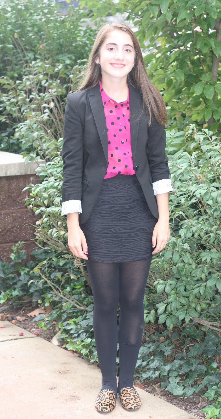 Today's outfit is incorporating hard and soft. I recently came across this button down in my closet, and suddenly had that feeling of Christmas when you discover something you forgot you had. Instead of choosing a solid button down, I went for this girly blouse with velvet polka dots all over it. To add some texture to my ensemble, I went for a wave looking body-con skirt. I not only wore black tights to keep warm, but also to make the top pop even more, as well a my loafers. I purchased these loafers over the summer and have been obsessed ever since. From the front they look like innocent leopard print loafers, but in the back they have an edgy-side with studs all over the heel. To avoid overdoing this already put together outfit, I just chose a black blazer out of the countless blazers I have obtained since the start of the school year.