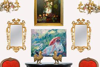 French upholstered stool | Missoni Necklace | Malachite bead necklace | Round glasses | French gilt chandeliers | French still life | Reclining girl oil painting | English gilt wood frame | Lacquered demi-lune table | Pair of Louis XV chairs | Vintage gold roosters | Vintage chinoise pillows | buddha | Antique pictorial rug