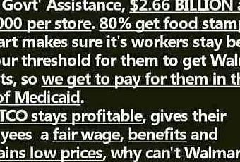 Wal-Mart would like for Americans to think they have to pay their employees poverty wages, or they wouldn't be able to keep their prices low. That's just not true. Costco is able to keep their prices down, while paying a livable wage (with benefits) to their employees -- and they turn a nice profit while doing it.The truth is that Wal-Mart could do it too. They just don't want to. By refusing to pay their employees a decent wage (with benefits), the owners of Wal-Mart are able to turn a healthy profit into an obscene profit. And they can get away with it because the taxpayers make up the difference by giving those workers food stamps, housing assistance, school lunches for their children, and other types of government assistance.