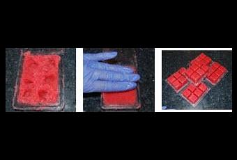 Step 7: Finally, begin scooping the mixture into the containers. Use your fingers to work the sugar scrub into each clamshell opening. When all 6 cavities of the clamshell are filled, place more of the mixture on top and flatten it down. Repeat for the remaining 4 clamshells. Then, close the lids. Allow the sugar cubes to fully set up overnight.
