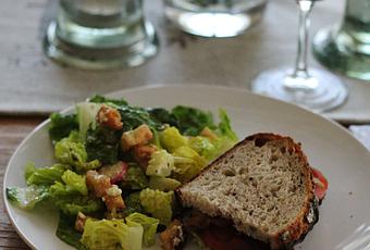 Simple summer dinner: salad with radish slices, feta, cucumbers, croutons, Annie's Shitake Sesame dressing. Bacon, red romaine lettuce, tomato, crusty artisan bread.