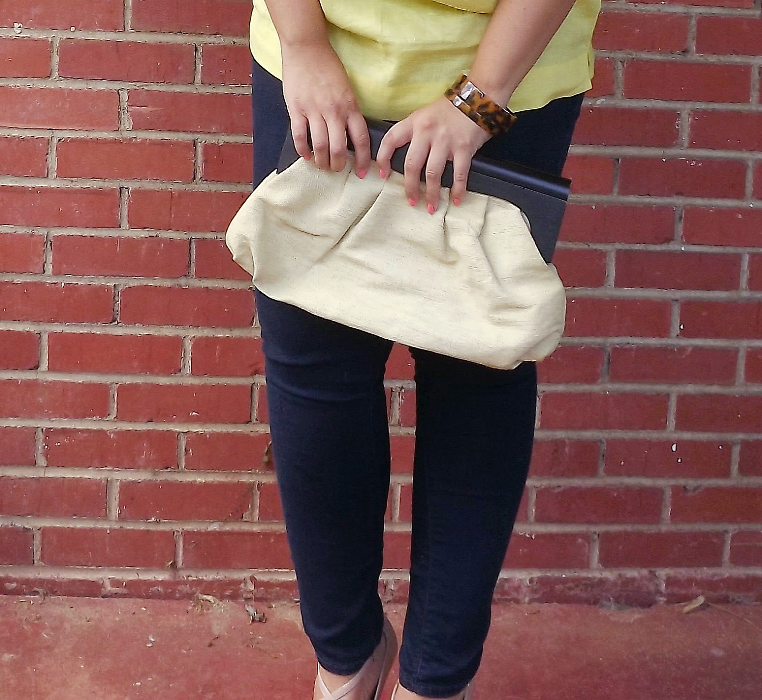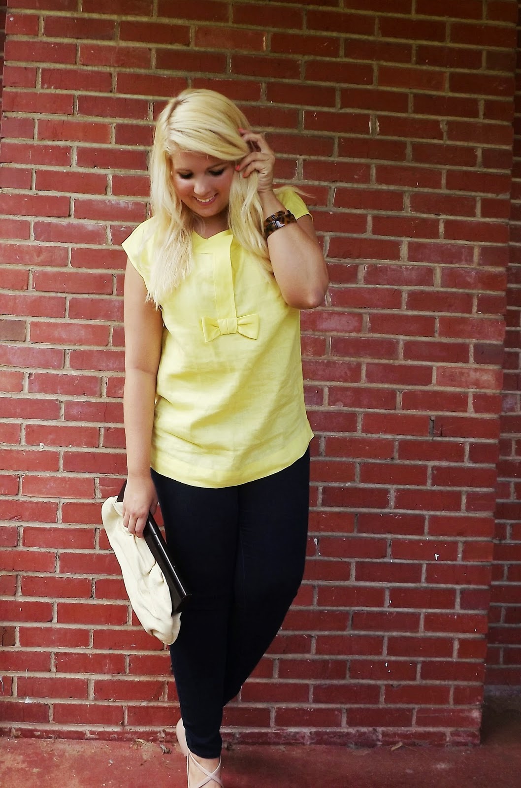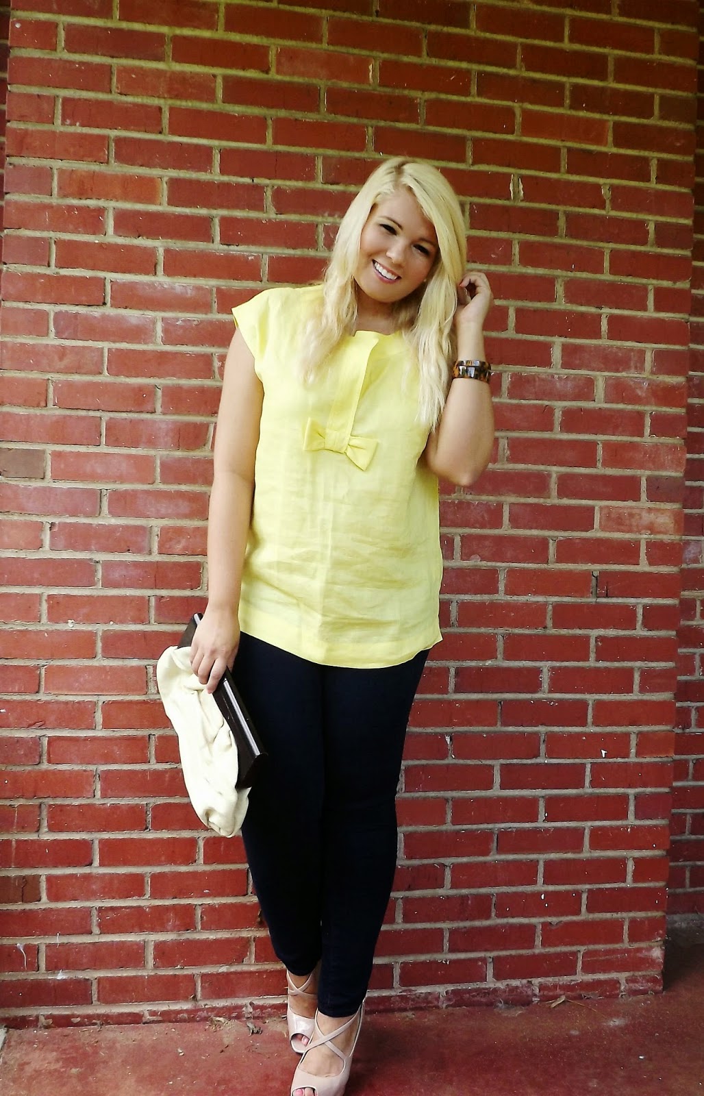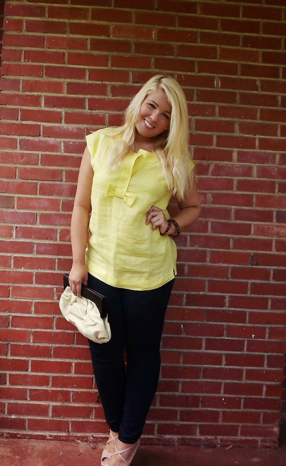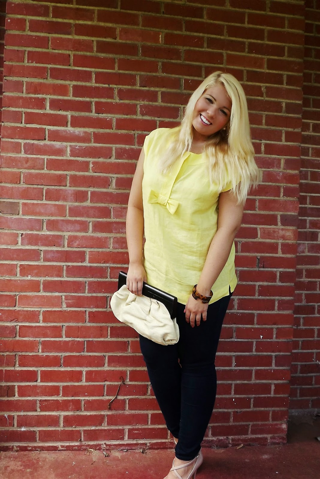 Outfit: Top- Talbots, Skinny Jeans- Old Navy, Heels- BCBGMaxazria, Clutch- Old Navy, Bangles- The Farm Basket Give me a little linen and some gorgeous yellow and I'm game! I picked up this number a week or so ago and LOVED it! I mean come on, the perfect shade of yellow, linen, and a gorgeous bow detail, it totally called my name. Adding tortoise bangles in gave the look a little bit more pop and took away the simplicity aspect. The canvas clutch is the perfect summer handbag accessory. I didn't love the cap sleeves, but I think I've changed my mind and actually love the look of it. This look is the perfect outfit for a summer cocktail hour. Summer cocktail hour can be a bit more casual so the top, skinnies, and heels are just casual enough, but the heels add the dress factor. I'm absolutely loving styling for summer! xoBCC