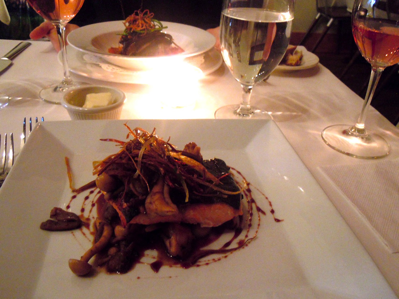 We each enjoyed a refreshing glass of rosé and a piece of their fantastic bread. Then, as my entrée, I had the grilled Artic char served with truffled wild mushrooms and crispy leeks in a red wine reduction. It was exquisite. Her ratatouille seemed delicious as well. And when it came time for dessert...