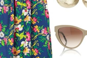 Strapless floral dress / Timeless patent leather shoes / Oryany crossbody handbag / Gold chain necklace / Gold earrings / STELLA McCARTNEY cat eye sunglasses