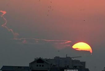 Sunset certainly would rank one among the most beautiful fleeting weather phenomenon in a day; perhaps the other one is Sun rise. People like them more than storms, rainbows, clear blue skies or nightscapes. As that pathway is lengthened, sunlight has the ability to hit more molecules in the air. The sun emits electromagnetic energy, as visible light. These molecules — like oxygen and nitrogen — are thousands of times smaller than the incoming visible wavelengths from the sun. Each one of those particles scatters, or changes the direction of, the sun’s visible energy. The air molecules scatter shorter wavelengths, such as blue and purples, removing them from our line of vision. Longer wavelengths, such as orange and red, can pass more freely to the ground, giving us the iconic sunset and sunrise colors.