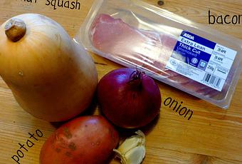You will need:1 butternut squash1 onion1 potato1 clove of garlic3 rashers of bacon1 stock cubeolive oil