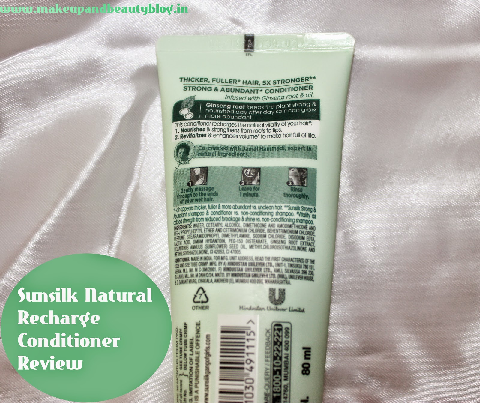 What Sunsilk Natural Recharge Conditioner claims:Sunsilk Natural Recharge Strong & abundant Conditioner makes the hair look two times thicker and up to five times stronger. It is infused with ginseng plant root extract that helps to strengthen, nourish, and recharge tired hair. Source: bigbasket.comIngredients of Sunsilk Natural Recharge Conditioner: Water, Cetaryl alcohol, Dimethicone and Amodimethicone and PEG-7 Propylheptyl Ether and Cetrimonium Chloride, Behentrimonium Chloride, Perfume, Stearamidopropyl Dimethylamine, Sodium Chloride, Disodium EDTA, Lactic Acid, DMDM Hydantoin, PEG-150 Distearate, Ginseng Root Extract, Helianthus Annuus(Sunflower) Seed oil, Methylchloroisothiazolinone and Methylchloroisothiazolinone, CI42053, CI47005How to use Sunsilk Natural Recharge Conditioner:Apply gently on your wet hair. Massage into scalp and rinse off with clean water.