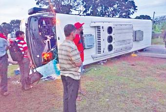 Twenty three passengers were injured when a super luxury bus, which was heading to Colombo from Jaffna, overturned in Kilinochchi last morning. Police said that the accident could have occurred due to poor visibility on the road as a result of the heavy rains experienced in the area. Police also said the driver had fallen asleep at the wheel.
