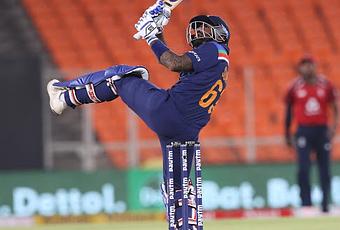 He dispatched the very first ball he faced from fearsome Jofra Archer for an agenda-setting six, never really let up, and showed India the way to bat first. Archer banged in a chest-high lifter at 144kph, but Suryakumar swiftly jumped back and nailed a one-legged pull with gum-chewing swagger and jaw-dropping timing. Suryakumar had pulled off a similar outrageous hit - a reverse-scoop - off Archer over Jos Buttler's head for six in IPL 2020.