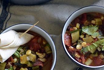 This soup is meatless, and to add some 'meat' flavor, I used bacon drippings as my oil (hey, if you don't want to do that, try a mixture of butter and olive oil for good flavors). Another idea would be to use a beef shank bone or fry up some chorizo if you prefer. Another ingredient that kind of takes the place of meat is the addition of two kinds of beans for protein. If you want to add a third can, honestly, this broth can take it.