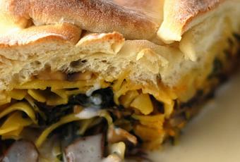 - 2 Tbsp (30 g) unsalted butter (including some for greasing) - 7 oz (200 g) pizza dough (which can be bought in specialty stores) - Some flour (for dusting) - 4 oz (120 g) fresh spinach - 6 oz (170 g) Cremini mushrooms - ½ oz (14 g) dried Porcini mushrooms - ¼ cup white wine - 1 Tbsp (15 ml) milk - 2 Tbsp (30 ml) heavy cream - 4 oz (120 g) tagliatelle pasta (either fresh or dried) - 1 egg - ¼ cup Parmigiano Reggiano - Some salt and pepperPreparation