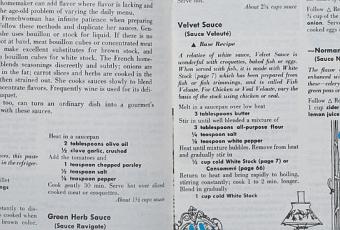 While I’m feeling nostalgic for all things Parisian, I couldn’t help but fixate on this page of Sauces, from The French Cookbook. The tipsy perspective evokes the feeling of walking the hills of Montmartre, the arrondisement where my favorite movie took place. Unlike my walks though, in which I relied heavily upon my imagination [and a dash of wistful voyeurism], Velvet Sauce truly puts us in Montmartre. We see the famous Sacré Coeur from our very own window, where wine surely flows generously, and the chairs straddle the line between comfort and formality. It’s the perfect venue for serving such a sauce!