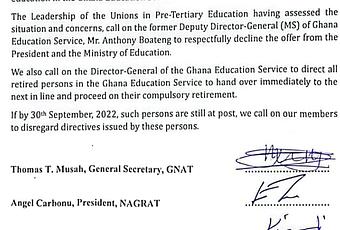 “The weekend has been inundated with concerns and agitations by the rank and file of education workers in Pre-Tertiary Education and other stakeholders on the issue of the post-retirement contract extension granted to the Deputy Director-General (MS) of Education and also the stay in office of other retired persons in education in the Ghana Education Service,” the unions said in a joint statement.