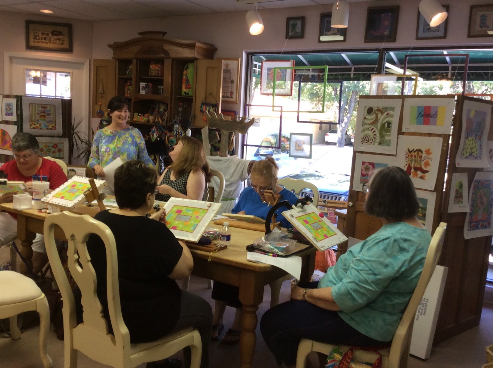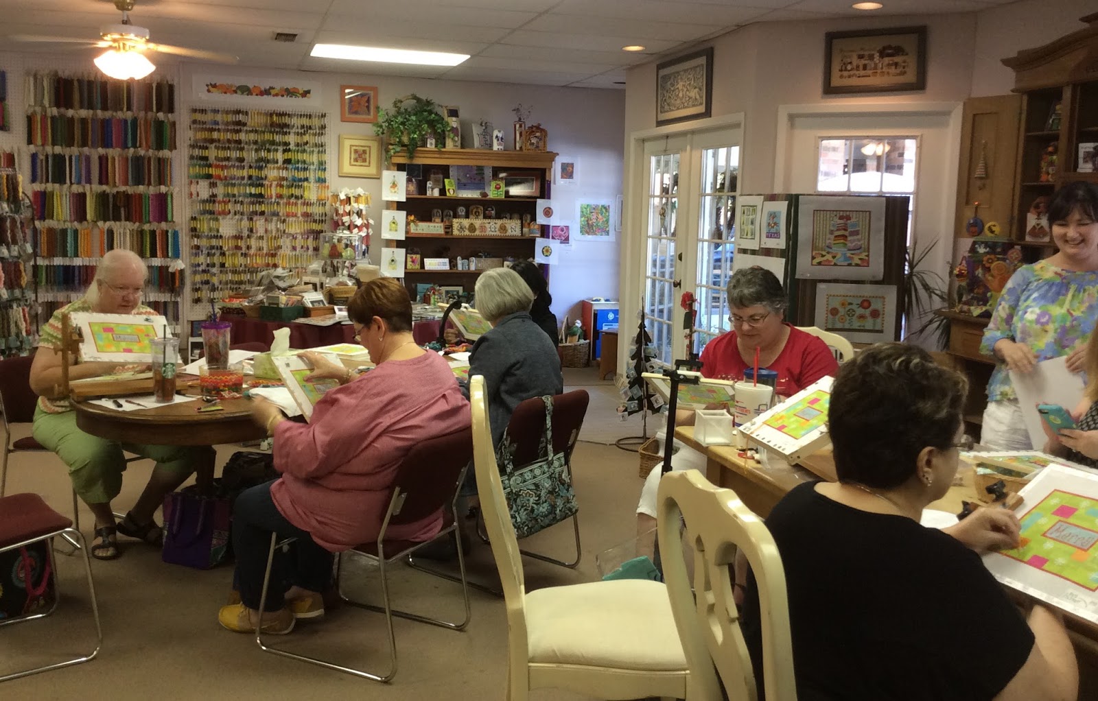 If you've been following my blog recently, you'll recall that I was pretty excited about my class last weekend at Fancy Stitches. The weekend has now come and gone, and for me at least, it was even better than I had anticipated. Being a novice teacher, I was a little nervous, especially when I realized my class was made up of 12 of the very best stitchers in the Fort Worth/Dallas area! I dare not estimate the combined years of experience in that room! I had nothing to worry about as it turns out, as I am very lucky to call these ladies my very good friends too, and everyone seemed to have a great time. The amount of progress everyone made on their canvas was really impressive, as was the fact that they stitched all day, hardly taking a break! I can't imagine ever being lucky enough to have a group like this again, but I can hope! I have to thank the shop's owner, Gayle, for taking the photos and sharing them with me. Here is a look at Table One:
