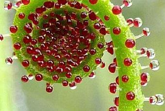 Its glistening leaves emit a scent and nectar to attract unsuspecting prey. The plant possesses two types of tentacles: one set secretes a sticky, mucus-like substance that traps insects, while the second set of spoon-shaped tentacles catapult insects into the center of the leaf in just 75 milliseconds. Once trapped, the insect is gradually digested.