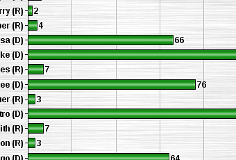 There are only two Republicans with a double-digit number in percentage of votes to protect the environment (Sen. Cruz with 15% and District 4 Rep. Hall with 11%) -- and those tiny percentages leave a lot to be desired. The Republicans have cast their lot with the corporations (oil, gas, coal, energy producers, and others) who are polluting the environment. They have decided that corporate profits are more important than clean air, water, and soil for ourselves and our children and grandchildren -- even though those polluters are making record-breaking profits, and could easily afford to clean up the pollution they produce.