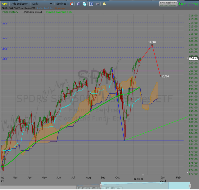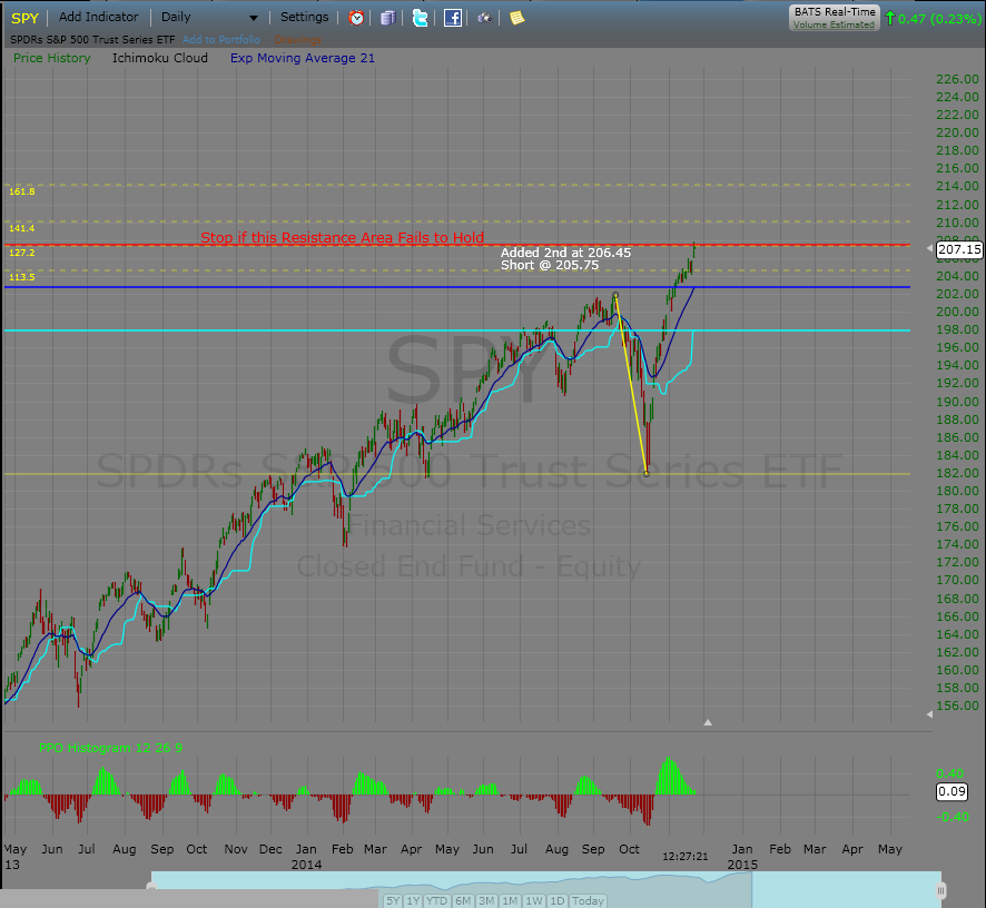 Once we hit the area of the upper price target, I was willing to speculate on a counter trend short play. Below is the current chart, which has the 21 EMA support area in blue, and the cloud baseline support area in cyan. Those are the areas of interest for me from a price standpoint. Chart: