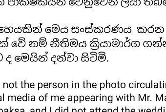 She clarified that she did not attend the wedding ceremony mentioned on Mahinda Rajapaksa’s official page and was not invited to the event.