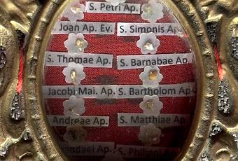 Here are the ex ossibus relics of the 12 Apostles in our custody: St Peter, the first Pope; St Matthew, apostle and evangelist; St John, apostle and evangelist; St Philip, St Barnabas, St Jude Thaddeus, St Andrew (Peter’s brother), St Jacob (major), St Jacob (minor), St Simon, St Thomas, and St Bartholomew. This reliquary was given to us by Fr. Richard Cannuli, O.S.A. It bears the seal of the Augustinians.