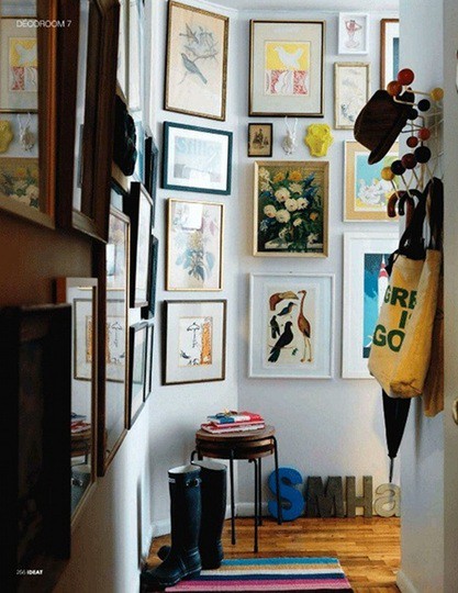 The higgledy-piggledy placement of framed pictures, prints, etc. sets a homely scene. The space is small but now useful too. Another Eame's Hang-It-All too. Just lovely.