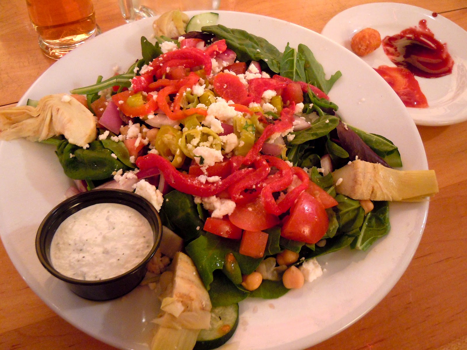 To get a jump start on my vegetable count for the weekend, I ordered the Greek salad which was served with a generous amount of garbanzo beans, just enough feta cheese, and a delicious tahini dressing. On the side, I also helped myself to our shared appetizer: sweet potato tator tots with a raspberry "mumble" sauce.