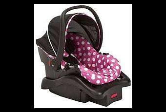 This adorable car seat definitely compromises flexibility for the cute factor! The Mickey ears and the pink polka dot versions got our test moms excited about this car seat, but after reviewing some of the options their excitement tapered off. Let's be clear that there are some great features here, especially for a cheap infant car seat. First, its 5-point harness is adjustable across 4 heights (with re-threading), and the crotch buckle is adjustable across 3 settings. Second, it was reasonably lightweight, making carrying around time quite a bit easier. Third, we thought the positioning of the shoulder strap adjustment was quite good, being high up enough to make adjustment possible even when the seat was attached to the base. Finally, let's comment again on how darn cute this thing is! But the positives end there. The weight range is extremely low, ranging from a great minimum of 4 pounds, but topping out at a measly 22 pounds or 29" tall. That's a really low upper limit and is quite disappointing! This seat is only to be used rear-facing. We also assumed the cute bowtie insert was for infant head support, but found that it did a pretty poor job overall of supporting a baby's head from flopping side to side. Finally, the build quality wasn't great; the carrying handle flexed a lot with a 20 pound baby in it, and the sun visor was flimsy. Overall, it's an OK last option for our list. If you think the Disney pattern is awesome, then this is the seat for your baby! Note that this is largely the same seat as the Cosco Light N Comfy seat.
