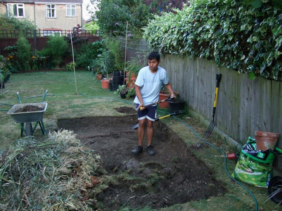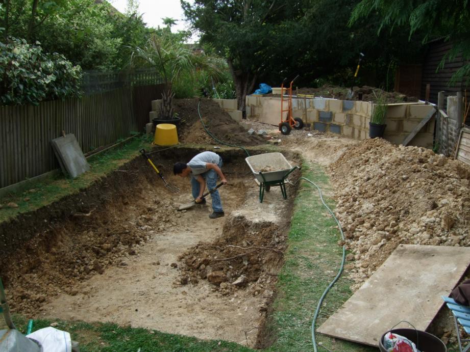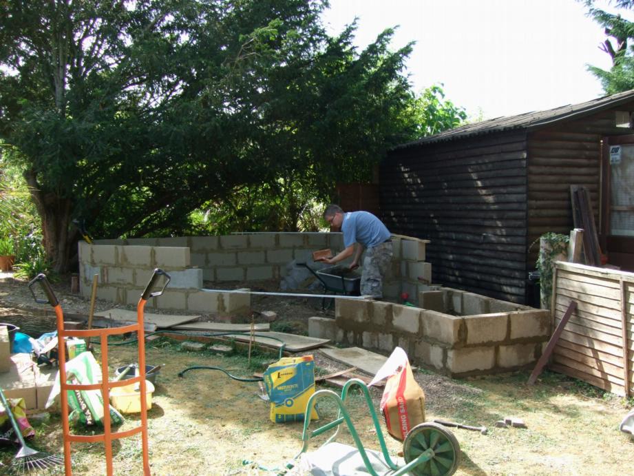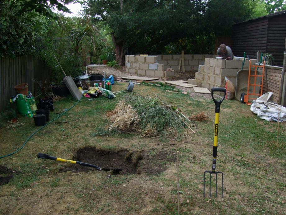 So with all this in mind we started work in May 2010. The first job was to build initial retaining walls for the first raised bed. We wanted to integrate a raised pond with raised beds to ensure the whole section of the garden was of a coherent design. Once these walls were built we could start the dig.I calculated that we would be digging out something in the region of 35 tonnes of clay and chalk, and this all had to be dug by hand as we only have a very narrow and awkward access to the back of the garden. We knew that this task would be the biggest single job in the whole project, so much so that we knew it would not be completed before the autumn and wet weather weather arrived.
