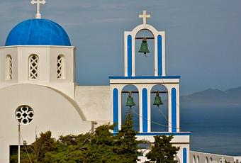 Blue-domed Church in Oia is one of Santorini's most famous. Oia looks as if it were stuck in time. There are many typical white houses, and narrow, winding streets. Oia sits at a high elevati...