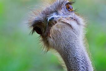 The ostrich is the largest and heaviest living bird. As its species name, camelus, suggests, the ostrich was once known as the “camel bird” because of its long neck, prominent eyes, and sweeping eyelashes, as well as its jolting walk. Also, like camels, the ostrich can tolerate high temperatures and go without water for long periods of time. Native to Africa, ostriches are found in savanna and desert regions, were they graze among giraffes, zebras, wildebeest, and gazelles.