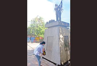 Ms Jasmine, granddaughter of A.E. Gunasinha, who was a pioneering trade union leader known as the ‘Father of the Labour Movement’ in Sri Lanka paying a floral tribute at the A.E. Gunasinha statue at Gunasinghepura yesterday. May 1st also marked the 131th birth anniversary of A.E. Gunasinha. Late President Ranasinghe Premadasa’s mentor was A.E. Gunasinha. However, it seems the Labour Leaders of our country have forgotten A.E. Gunasinghe. The annual commemorative event held at his statue in Colombo to mark International Labour Day (May 1st) to honor the great man was a non-event, this year. The remnants of the garland placed on the statue on May Day last year was seeing hanging by a thread. Is this the gratitude shown to this pioneering Trade Union Leader?