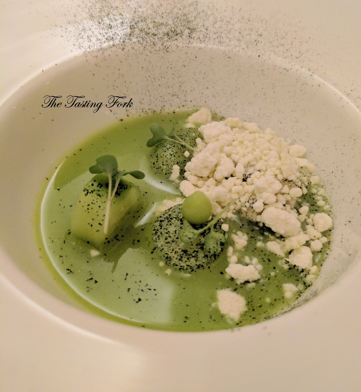 The new summer menu consists of all the courses and several dishes under each. I started my meal with a Green Gazpacho- a cold soup with cucumber gel and pickled cucumber, and crème fraiche sorbet crushed into pieces and sprinkled on top. The pickled cucumber was my favorite part about it! Tart and so well-balanced! Sprinkle some black pepper on the gazpacho and you’re all set.