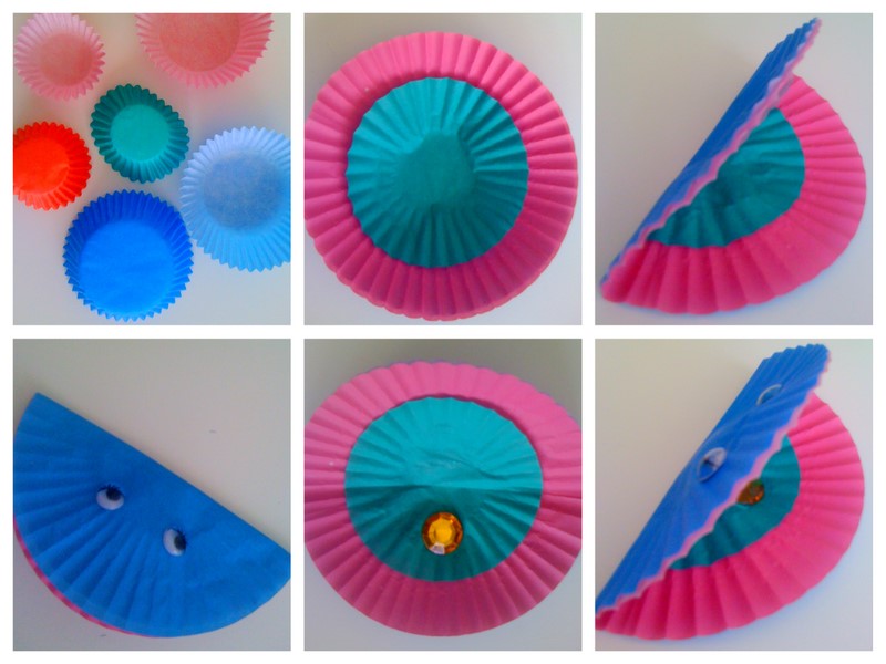 2.Stick the 2 large patty pans together (so that the colours are visible on both sides).3.Stick the smaller patty pan on what will be the inside colour.4.Fold the shape in half so that the small patty pan is inside.5.Stick or draw google-eys on the outside.6.Stick a gem or pearl on the inside.7.Use your hand to open and shut the happy oyster and make him sing!