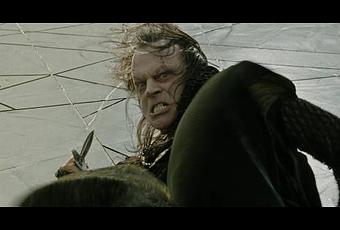 The latter, after seeing his staff break, humiliates his servant once too much and immediately pays the price. Grima stabs him in the back like that before being struck down by an arrow from Legolas. Wounded to death, Saroumane then made a spectacular fall to the bottom of his tower.