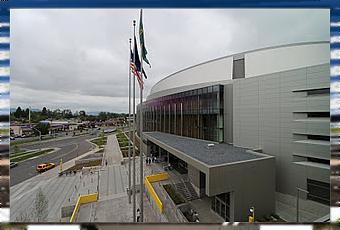 As for attracting athletes, there is some question as to the new facilities effectiveness. A recent talk show questioned whether all the amenities that are now available on campus truly do attract more, and better athletes. Because that is the true purpose of these facilities: to create a more inviting campus for athletes. The resulting consensus was that no matter how many new facilities Phil Knight may help build on campus, the University of Oregon will not be able to recruit to the same level as teams in other conferences (i.e. – the Big Ten), simply because of the location. The truth is, Eugene itself is not nearly as attractive as other cities, and no amount of shiny new facilities can alter that perception. It is debatable as to whether or not the Jaqua Center and the Matthew Knight Arena actually the goals they were intended for. That being said, the Matthew Knight Arena is a well-detailed space, with great intentions, and considering the large price tag, all that money had to go somewhere. There is truly a feeling that not a single corner or space was left or forgotten by the architects, and the spectacle of the interior space is magnificent. The amount of drama that has been orchestrated shows that with great vision, one can create great spaces. The arena also has become a strong visual landmark, standing tall at the Northeast corner of campus.