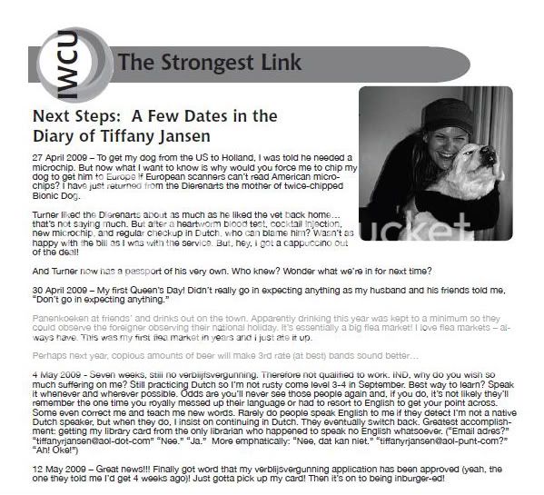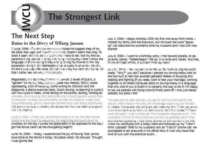 My involvement with the IWCU’s bimonthly publication started with the March/April 2009 issue when my New Member Profile was published. Since then, I have been writing my own column for their bi-monthly magazine entitled Next Steps: Dates in the Diary of Tiffany Jansen. Beginning in November, I will be posting the entries here as well. To read past entries and see what I’ve been up to, click on the links below.