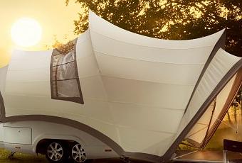 The Opera Camper is like a pop-up luxury suite you can take with you anywhere. Elegant features include a teak veranda, two electrically-adjustable beds that can be combined to make for a larger single sleeping surface, a boiler for hot-water in the compact kitchen, a top-loading fridge with 36L of storage, a ceramic toilet, LED lighting, and a corian fountain with pull-out faucet head that doubles as an outdoor shower.