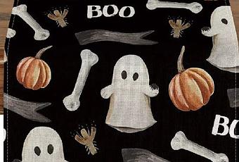 -- Add this Halloween decoration to your dining room! This table runner is decorated with watercolor ghosts, pumpkins, and bones.