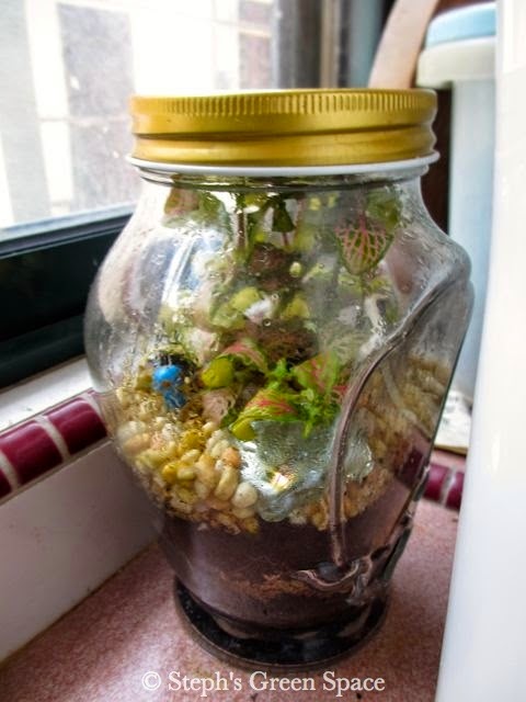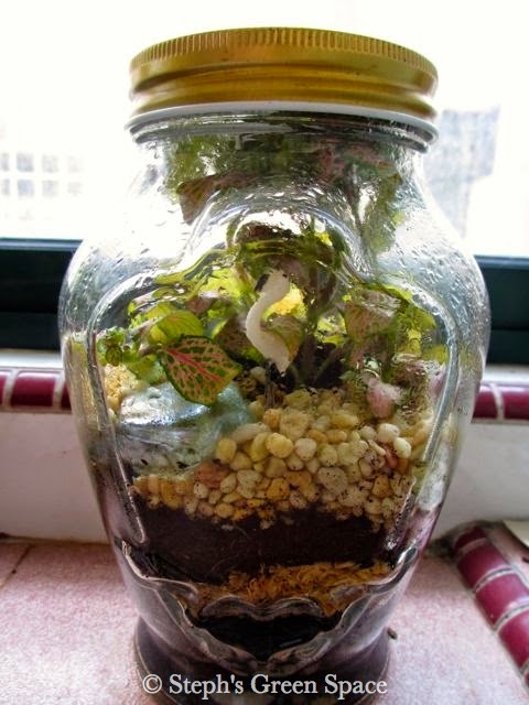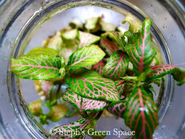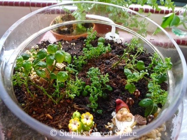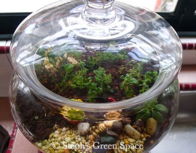 Keeping my fingers crossed after I watered the little plants, dug out some ugly green mosses, trimmed off some yellowed and browned leaves and cleaned the glass inside and outside. Now I have to remember that I can't leave terrariums to too much heat and light.