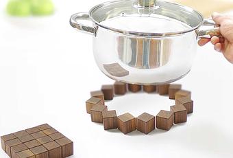 QUAD consists of 16 wooden cubes – oiled walnut or maple – connected by a silicone ribbon inserted in the underside of the cubes. The silicone ribbon is flexible, yet durable and heat-resistant. This structures allows various configurations ranging from a compact square to a widespread circular shape.
