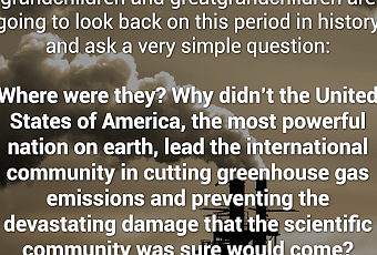 Bernie is right. Our grandchildren and their children are going to want to know how we could ignore the warnings of 95% of scientists and 97% of climatologists, and leave them a world much worse than the one we inherited. What are we going to tell them? We didn't want a Black president to get credit? We didn't want giant corporations making record profits to have to clean up their pollution? We were trying to please an ignorant anti-science base of religious voters? I don't think they'll accept those feeble excuses -- and we shouldn't either.