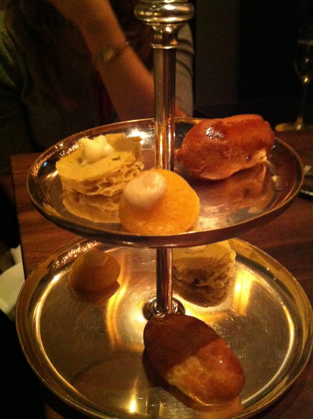 We started with several h'ordeuvres including the house made apple cider with ginger mousse, crispy kale with creme fresh and chicken skin, a selection of savory pastries, mojito macaroons, and a smoked salmon with beet root and creme fresh. Everything we tried was delicious and extremely creative; I had a hard time choosing a favorite but it was between the mini cheese eclair from the pastry selection and the smoked salmon.