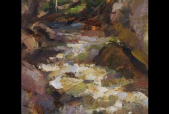 Most of the water was done with a palette knife in order to preserve pure, clean mixtures layered one on top of the other. I couldn't have kept the colours so fresh if I'd applied them with a brush; they'd have mixed on the canvas and diminished the sense of sparkling light. The palette knife also created texture that helped to describe the many levels of rocks that broke the water as it flowed downhill.